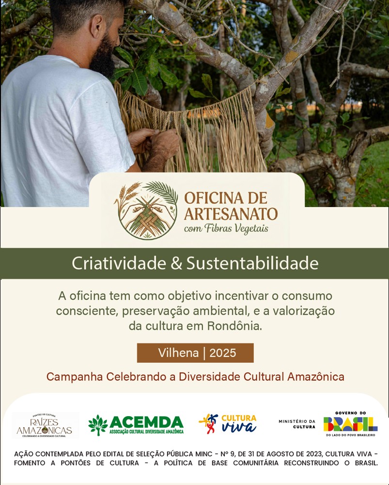 O Pontão de Cultura Raízes Amazônicas: Celebrando a Diversidade Cultural, coordenado pela Associação Cultural, Educação, Meio Ambiente e Desenvolvimento Sustentável Diversidade Amazônica (ACEMDA), realiza nesta segunda-feira (15), às 19h, a “Oficina de Artesanato com Fibras Vegetais: Criatividade & Sustentabilidade”, em Vilhena (RO). A atividade integra a campanha “Celebrando a Diversidade Cultural Amazônica”, voltada à preservação ambiental, ao consumo consciente e à valorização da cultura local por meio da produção artesanal com matérias-primas naturais da Amazônia Legal.