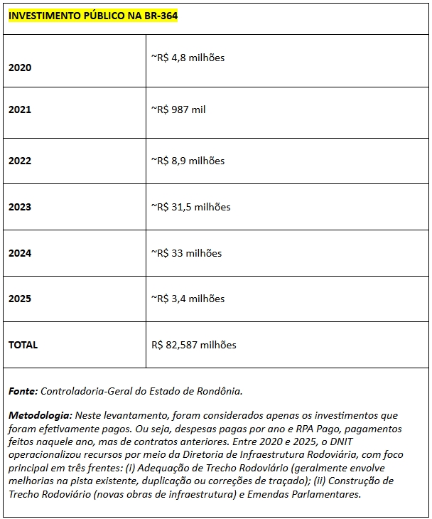 Levantamento técnico realizado junto à Controladoria-Geral do Estado de Rondônia e baseado no fluxo de caixa real do governo, mostra o volume de investimento público no eixo Vilhena-Porto Velho. Entre 2020 e 2025, o valor total dos investimentos públicos realizados na BR-364 foi de R$ 82,587 milhões, um valor 9 vezes menor que o aporte que a concessionária prevê somente para o ano de 2026. O melhor desempenho público recente foi em 2024, com cerca de R$ 33 milhões — valor que a concessionária deve superar em menos de um mês de operação em 2026.