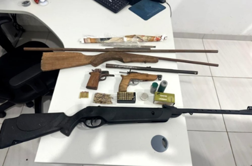 Entre os materiais apreendidos estavam dezenas de cartuchos calibre .22, uma garrucha de fabricação caseira, uma espingarda de pressão, barras metálicas possivelmente utilizadas para confecção de canos de armas, além de pólvora, espoletas, chumbadas e eletrodos utilizados em soldagem.