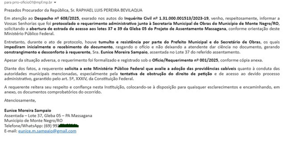 Uma cena de autoritarismo e desprezo pelas instituições públicas marcou mais um capítulo da gestão municipal de Monte Negro. O agricultor Gilberto Carvalho e sua esposa Eunice Moreira Sampaio, moradores do Projeto de Assentamento Massangana, procuraram a Prefeitura de Monte Negro para protocolar, de forma pacífica e documentada, um pedido de abertura de estrada que dá acesso à propriedade do casal — um direito garantido por lei e respaldado em recomendação do Ministério Público Federal (MPF). O que receberam em troca foi humilhação, constrangimento e violência simbólica no dia 23 de setembro.