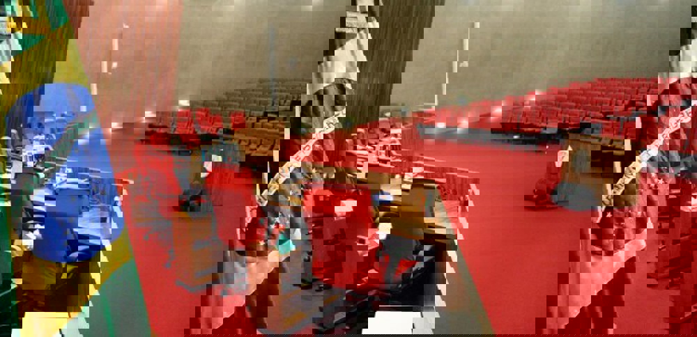 Plenário amplo com carpete vermelho. À esquerda, a bandeira do Brasil em destaque. À frente, uma bancada de madeira com cadeiras vermelhas giratórias e microfones sobre a mesa. Ao fundo, várias fileiras de poltronas vermelhas para o público. O espaço está vazio e bem iluminado.